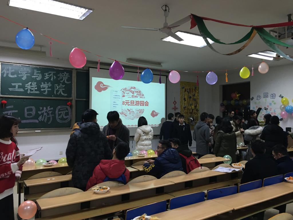 化环学师生携手共庆2018年元旦 作者:发布时间:2018-01-02点击率: 本网讯(通讯员 陈思)12月29日晚,化环学院2018年元旦游园会在流芳校区L1103教室举行。学院党委副书记苏纯华、学院工会主席袁华以及学院学生工作办公室、专业教研室老师们来到同学们中间,师生欢聚一堂共度元旦庆祝新年。 活动现场准备了多彩的节目和各种游戏,师生一道在互动的过程中共话一年来的收获,共迎新年的到来,共同祝愿化环学院全体师生新年新气象、新年新篇章。