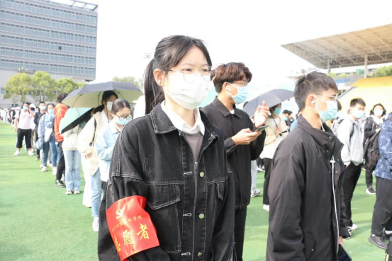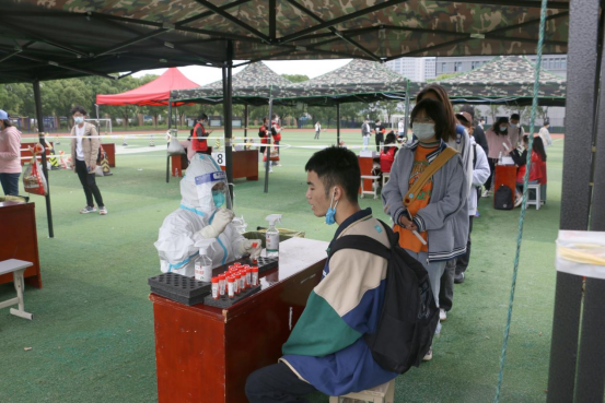 早晨8点,第一班的20名志愿者全部按时到达运动场指定地点进行准备工作。经过工作人员的培训和指导,志愿者很快进入状态,投入工作,与医护工作人员默契配合,开始了一天的核酸检测任务。