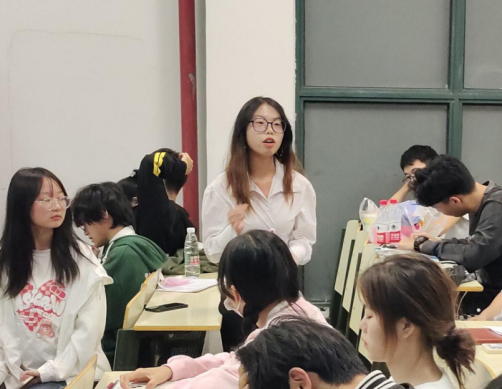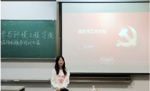 来自2021级环境工程01班的陈冉作为优秀团支书发言。她利用精美的PPT从团支部简介、支部任务、支部风采和未来展望四个方面分享了她作为团支书的经验,帮助新生团支书们更好的了解自身工作与任务。