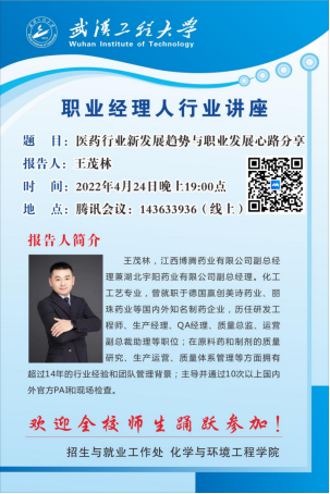 (通讯员李俊闹)为了让我院2019级本科生能够更深入了解行业的就业前景,提前做好职业规划。4月24日晚上19:00,9428cn太阳集团古天乐邀请湖北宇阳药业有限公司副总经理王茂林通过线上“腾讯会议”方式召开就业指导讲座,学院2019级全体本科生参与该讲座。