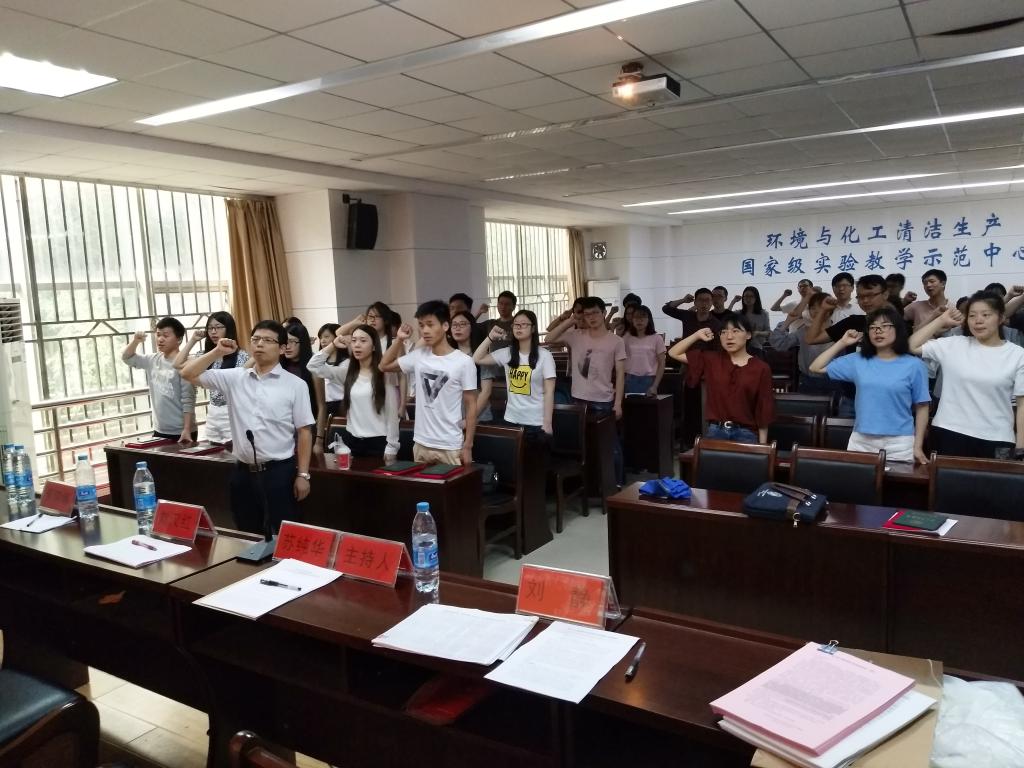 6月13日上午,化学与环境工程学院2017届毕业生党员入党宣誓仪式暨爱校荣校主题党课在流芳校区1号实验楼1101会议室隆重举行。学院党委书记刘汉红、党委副书记苏纯华、学院学生工作办公室李琪娜、刘静老师和2017届全体毕业生党员共同参加。仪式由党委副书记苏纯华主持。