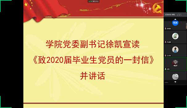 考取西北工业大学硕士研究生的毕业生党员李泽艳作为学生代表首先进行发言,回顾了自己成为正式党员的点滴历程,并真诚感谢母校和党组织的培育之恩。随后,学院党委副书记徐凯宣读《致2020届毕业生党员的一封信》并讲话。他对同学们提出了两点殷切希望,一是要牢固树立“不忘初心,努力奋进”的信念。二是希望同学们立场坚如磐石,时刻与党中央保持高度一致。