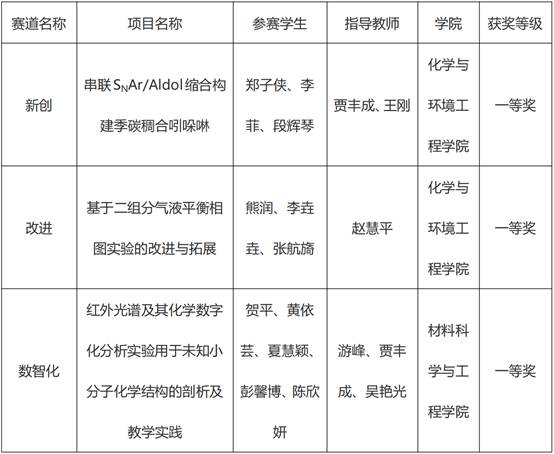 经过激烈的角逐,由贾丰成、王刚老师指导的2022级应用化学专业郑子侠、李菲、段辉琴三位同学的作品“串联SNAr/Aldol缩合构建季碳稠合吲哚啉”斩获“新创实验”赛道华中赛区一等奖。该团队设计了一条绿色反应路径,以3-甲基-2-吲哚酮和2-氯-5-硝基苯乙酮为底物,通过串联SNAr和Aldol缩合,发展出碱促进的高效构建季碳稠合吲哚啉的新方法。此外,团队还根据不同专业学情,将实验设置为基础版、进阶版和高阶版,实现对学生实践动手和创新能力的梯度化、层次化培养,且通过可重复性考察验证了实验适用于本科教学。2022级应化专业学生熊润、李垚垚、张航旖的作品“基于二组分气液平衡相图实验的改进与拓展”在赵慧平老师的指导下也斩获“改进实验”赛道华中赛区一等奖。该团队基于二组分气液平衡相图实验进行改进与拓展,对传统实验装置进行了全面改进,有效解决了传统实验中存在的分馏效应,冷凝干扰与取样干扰等问题,同时,引入浊点滴定法与理论模拟法,实现了三组分液液平衡相图内容的拓展和数字化理论模拟程序的结合,项目改进结果能够帮助同学们更好地理解相图理论的基本原理,同时能够锻炼和培养学生的跨学科思维和动手能力。游峰、贾丰成、吴艳光老师指导的贺平、黄依芸、夏慧颖、彭馨博、陈欣妍等的作品“红外光谱及其化学数字化分析实验用于未知小分子化学结构的剖析及教学实践”获得华中赛区一等奖。该项目该团队通过红外及质谱数据,结合DX-Echo模型,完成了对未知物的结构解析,对官能团进行了精确定位,取得了良好成效。通过数字化技术辅助完成结构解析,提高了未知物检测的精确度。同时在教学过程中,从“谱”到“构”,PBL(Problem based learning)的教学方法,犹如“开盲盒”,猜谜一般的学习过程也大大提升了同学们的学习热情。