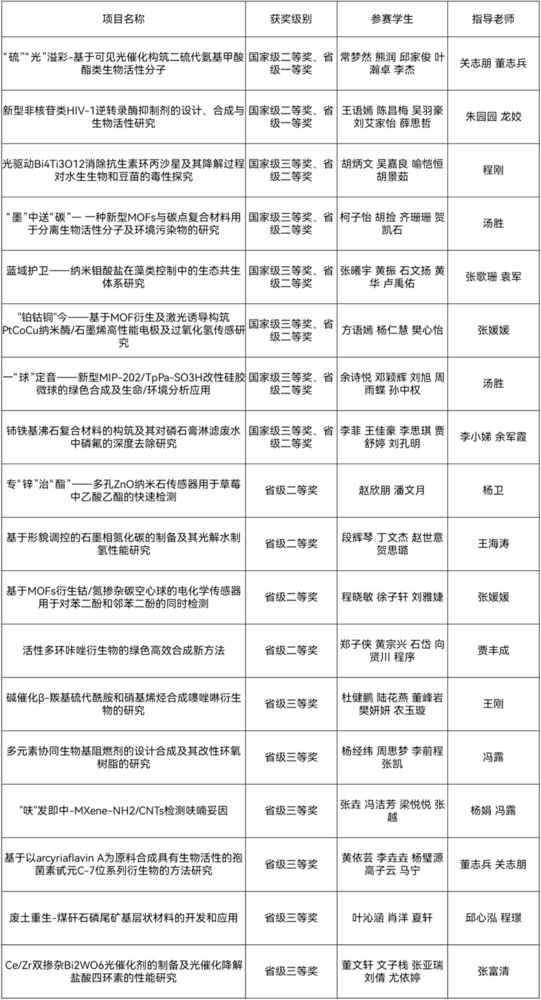 本网讯(通讯员 贾丰成)7月12日,第十届全国大学生生命科学竞赛(2025,科学探究类)圆满落幕。在学院的积极动员和精心组织下,我院师生再次在该项高水平全国性赛事中表现优异,斩获国家级二等奖2项、国家级三等奖6项、省级二等奖4项、省级三等奖6项,共计18项荣誉! 获奖学生覆盖2021级至2023级应用化学、环境工程专业本科生。