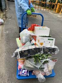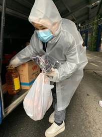 从开始在群里通知业主们自己领取,再到后来为减少接触,志愿者们对着各类物资清单逐一确认后,一一搬运到小拖车上,一个单元一个单元分批按门铃通知大家排队有序领取。由于各类物资近百种,总会出现错拿漏拿,我们又改进发放方法,志愿者们各守几类物资阵地,业主们按购物序号间隔领取。然后我每天穿梭于数百种各类生活物资摆出的阵地之间,为每一位业主配送货物,和业主本人一同检查并核对物资清单,场面热闹非凡、忙而有序。这是我们实战中摸索出的高效配送方案,也源于我们志愿者们之间的默契配合,相互搭把手、传个话、一个眼神、一个动作大家心领神会。每一位领取物资的人都会由衷地说一句:感谢你,辛苦啦!这样的工作伙伴这样的工作场景,我只想说累到满心欢喜!