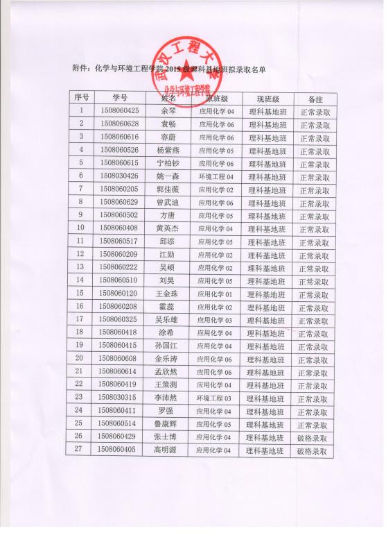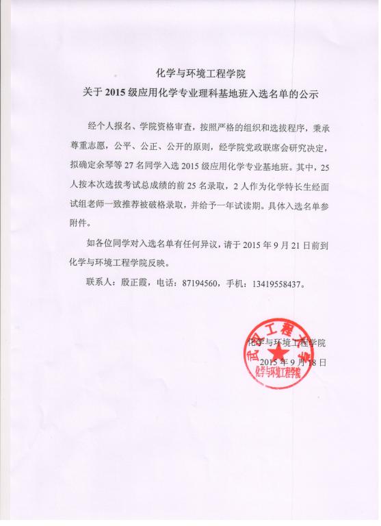 9428cn太阳集团古天乐关于2015级应用化学专业理科基地班入选名单的公示