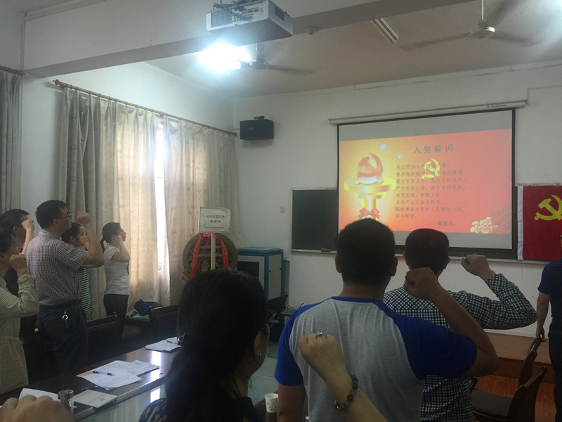 副院长董志兵、王营茹为全体与会党员发放了党徽。全体党员同志面向党旗集体重温入党誓词。