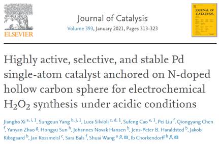 (通讯员陈俊)2021年1月,催化领域顶级期刊《Journalof Catalysis》(一区,Top期刊)刊登了我校青年教师奚江波老师与华中科技大学、丹麦技术大学、哥本哈根大学、塔夫茨大学、安特卫普大学、波士顿学院和韩国科学技术院等高校和科研机构合作的研究成果:《Highlyactive, selective, and stable Pd single-atom catalyst anchored on N-dopedhollow carbon sphere for electrochemical H2O2 synthesisunder acidic conditions》(DOI: 10.1016/j.jcat.2020.11.020)。分散在固体载体上的单原子催化剂(SACs)具有单一活性位点(如孤立的原子金属物种),近年来在催化领域中引起了极大的关注。针对单原子催化剂电子结构的优化以及稳定性等问题,奚江波老师和合作者们报道报告了一种简便的合成方法,该方法可在还原的氧化石墨烯/N掺杂的碳空心碳纳米球(Pd1/N-C)上稳定原子Pd物种。Pd1/N-C催化剂表现出了电化学下H2O2的高产率。即使经过10,000次循环稳定性测试,也能保持单原子结构及其高H2O2生成量。单原子钯的存在及其与N的配位结构是其高活性、高选择性和稳定性的原因。此外,这次工作还发现N配位数和Pd原子周围的杂掺杂原子对于优化中间体*OOH的吸附能至关重要,从而可有效提高电化学制备H2O2活性和选择性。