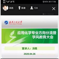下半场应用化学专业会议由教研室副主任陈伟主持。汤胜老师开篇主要从应用化学基本情况、课程设置、专业发展、师资力量等方面进行介绍,提出“你们究竟关心什么、我们应该关心的是什么、还有没有不为人知的你们所关注的问题”等。随后,汤胜老师就学院学风建设与学生们分享有关事例,详细分析了少数学生学习上懈怠的原因,希望学生看向长期远景,树立正确的世界观、人生观、价值观。最后,陈嵘教授对下半场宣讲会进行了总结,他强调,同学们一定要结合自身实际情况选择适合自己的方向,激励学生珍惜大学的宝贵时光。