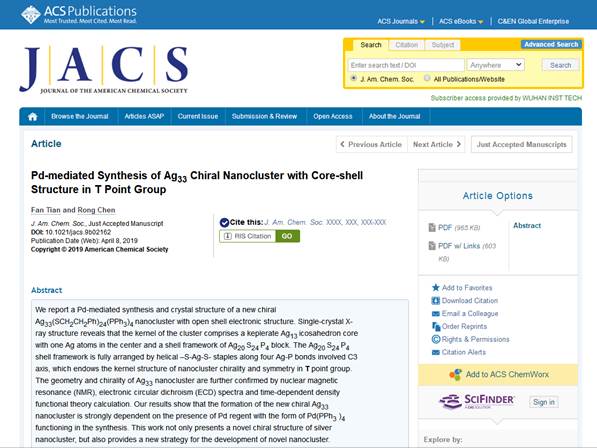 2019年4月8日,化学领域国际顶级期刊《美国化学会志》(Journal of the American Chemical Society, JACS,影响因子14.357)在线发表我院陈嵘教授课题组在Ag基纳米团簇方面取得重要进展——“Pd-mediated Synthesis of Ag33Chiral Nanocluster withCore-shell Structure in T Point Group”(唯一通讯单位,唯一通讯作者)。该论文的第一作者为我院应用化学专业在读博士研究生田凡,这也是我院研究生首次在世界顶级学术期刊上发表学术论文。更值得一提的是,田凡同学是我院2009级应用化学专业本科生、2013级应用化学专业硕士研究生、2016级应用化学专业博士研究生,是在武汉工程大学自己的“本科-硕士-博士”完整体系下培养的第一个学生,充分体现了武汉工程大学人才培养质量。田凡同学本科、硕士、博士阶段均师从陈嵘教授,也实现了陈嵘教授一直坚守的“Made in WIT”人才培养理念。田凡同学经过在武汉工程大学十年的磨炼,在科研上取得了一个又一个的突破,两度获得研究生国家奖学金。截止到目前为止,他以第一作者共发表SCI论文6篇,其中包括JACS在内的中科院一区论文3篇(J. Am. Chem. Soc.,Journal of Catalysis, ChemSusChem),2区论文2篇(Ind. Eng. Chem. Res., CrystEngComm),3区论文一篇(New J. Chem.),获得授权发明专利2件。
