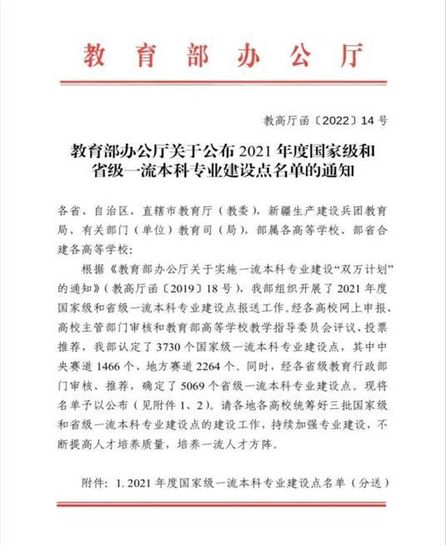 (通讯员 周旋)近日,教育部发布了《教育部办公厅关于公布2021年度国家级和省级一流本科专业建设点名单的通知》(教高厅函〔2022〕14号),我校获批2021年度国家级一流本科专业建设点6个,获批湖北省省级一流本科专业建设点6个。我院环境工程专业入选国家级一流本科专业建设点,这是我院继2019年应用化学专业入选国家级一流本科专业建设点之来的第二个入选专业。这是对我院专业建设和人才培养成效的充分肯定。