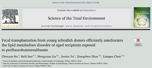 9428cn太阳集团古天乐胡陈艳博士与中国科学院水生生物研究所陈联国研究员利用斑马鱼为模式生物,通过移植年轻斑马鱼粪便到老年斑马鱼,发现粪菌移植可彻底拮抗PFBS的内分泌干扰效应和生殖毒性,将老年个体的内分泌系统重塑为年轻表型,促进卵子发育,提高繁殖能力。同时,另一工作也发现粪菌移植可以显著促进老年个体的生长,减轻老龄化及PFBS引起的肝组织损伤。对老年动物的脂质代谢能力也具有显著激活能力,能有效地抑制由老龄化或/和PFBS引起的代谢异常,将血液甘油三酯的浓度恢复至年轻动物的水平(此工作发表于另一Top期刊Science of the Total Environment(Hu et al, 2022, 823, 153758;IF:10.753))。以上研究为粪菌移植在环境与健康领域的应用提供了新的思路,将助力粪菌移植成为污染物毒性干预及健康老龄化的新策略。