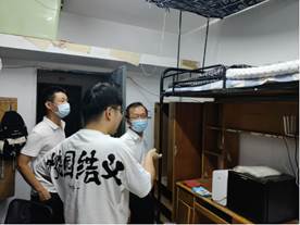 走访过程中,老师们与同学亲切交谈,向同学们表达了关心,询问了大家的生活状况,在沟通中了解了多个宿舍的具体情况,检查了新生宿舍的卫生状况,叮嘱了同学们多关心帮助即将入住宿舍的新同学。同时,希望同学们严格遵守学校疫情防控要求,做好疫情防控常态化形势下的自我管理和自我监督。张宗良一行还向宿舍管理管理人员详细询问了宿舍区安全防范和消杀工作,叮嘱宿管人员务必按照防控要求做好宿舍区常规消杀工作,确保宿舍区安全。