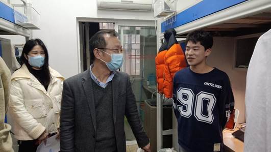 张宗良一行在走访过程中,一是了解同学们的假期生活、开学准备等情况,叮嘱同学们在学期初要快速调整学习状态,不断提高专业知识和专业素质,为新学期打下坚实基础。二是询问同学们在住宿上的问题,并特别关注了更新后的宿舍热水系统,嘱咐同学们要维护好一个干净整洁的宿舍卫生。三是与同学们详细探讨了新学期的学习计划、卫生习惯等重点事项,叮嘱学生要认真学习,珍惜大学生活,切实回应国家和社会的号召,为祖国谱写时代新篇章!