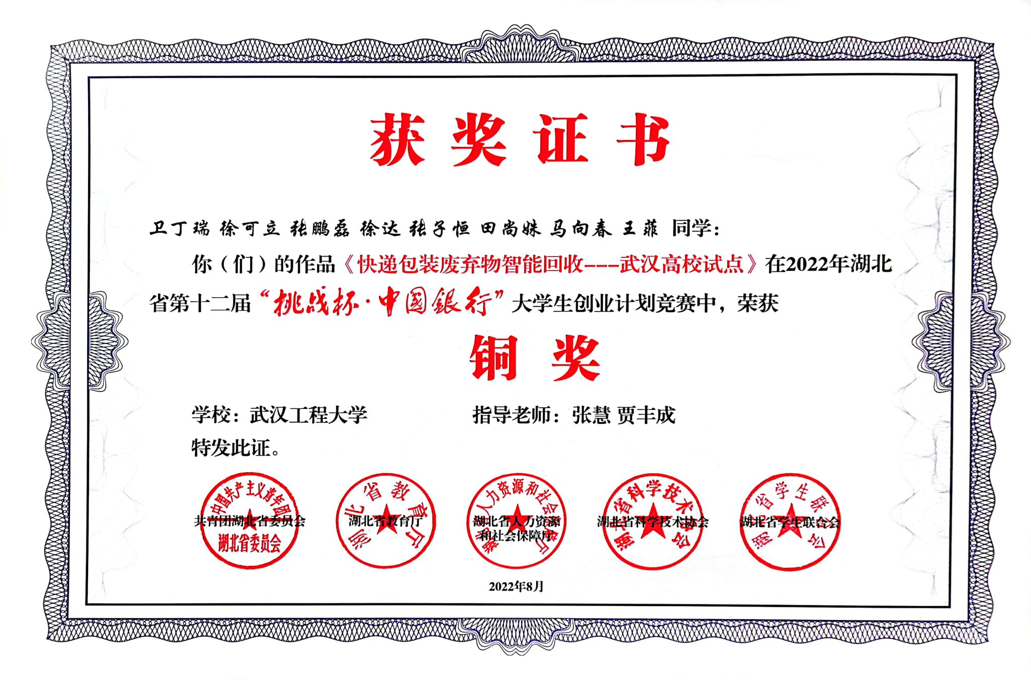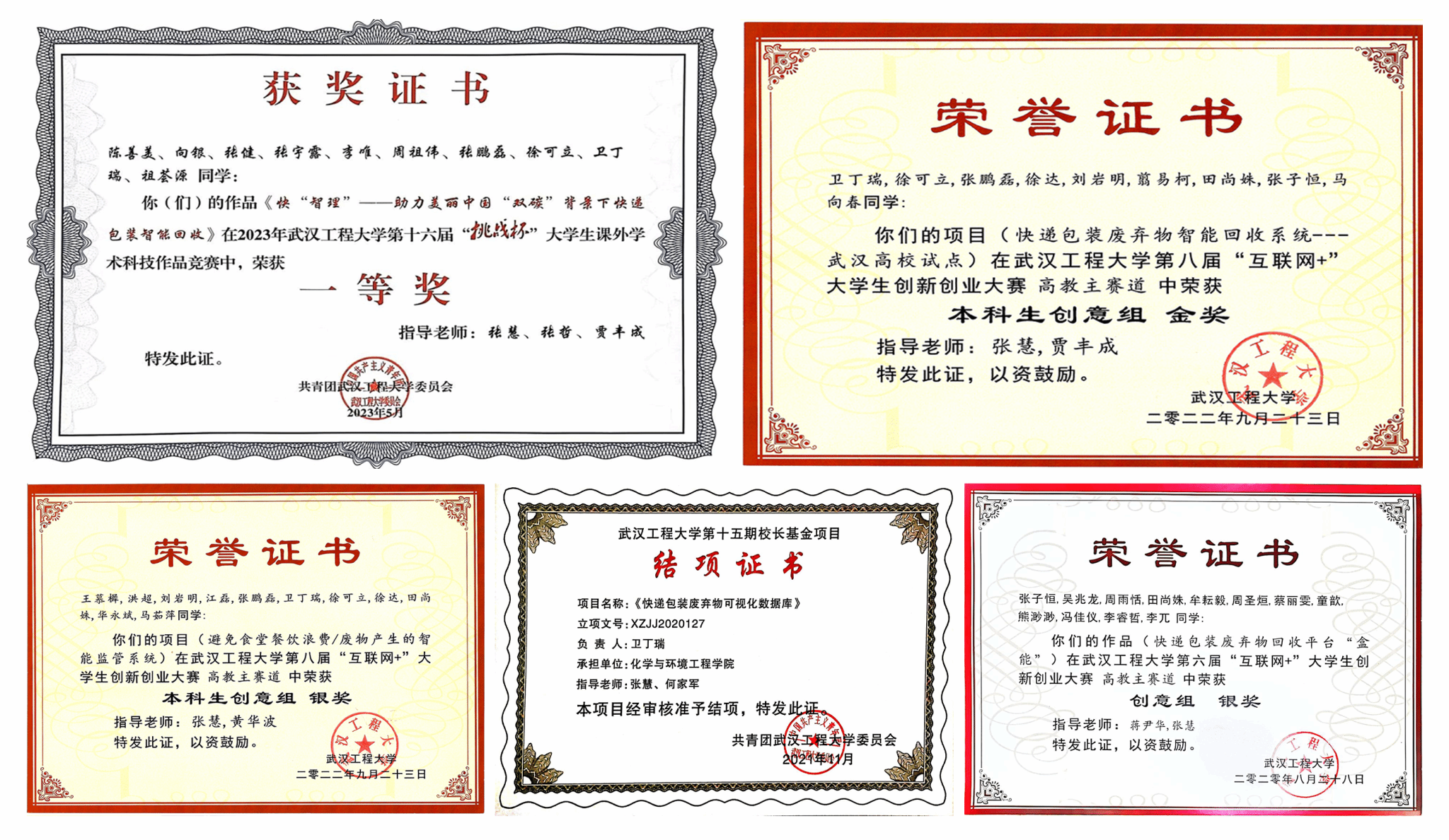 2019级环境工程02班同学乐观上进,理论知识扎实、有较强的科研能力以及创新、创业精神。周晓萌在2021年APM/CM亚太地区大学生数学建模大赛中荣获三等奖,郭培芸在2021年第五届“丝路杯”全国数独大赛全国总决赛中荣获最佳优秀奖和2020年校级每日阅读优秀奖,王菲在2020年湖北省翻译大赛中荣获三等奖。在班主任张慧老师的指导下,一些同学取得了相关创新创业、科研和学科竞赛成果,如卫丁瑞、徐可立、田尚姝、王菲、蔡青青、王慕樨、周晓萌、蔡彬、郭培芸、冯佳仪、张文霖、赵小玉等17名同学获批2项国家大学生创新创业项目,校长基金项目2项,以及互联网+项目获奖和挑战杯竞赛获奖7项(包括省奖1项,校级一等2项),以及参与发表论文3篇、申请专利10项,授权专利3项和软著2项。其中,卫丁瑞同学作为队长获批国家级大学生创新创业项目2项,作为法人注册公司1个,校长基金结题1项,作为队长获省级挑战杯1项、校级金奖和铜奖共2项,参与发表SCI论文2篇(影响因子大于10的论文2篇)和授权专利2项,第一著作权人授权软著1项。