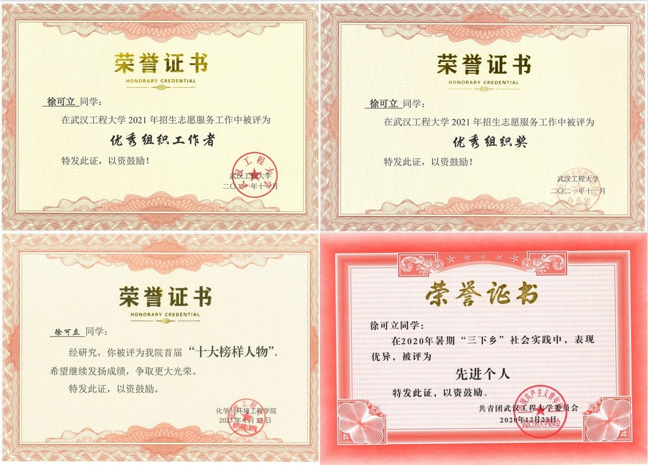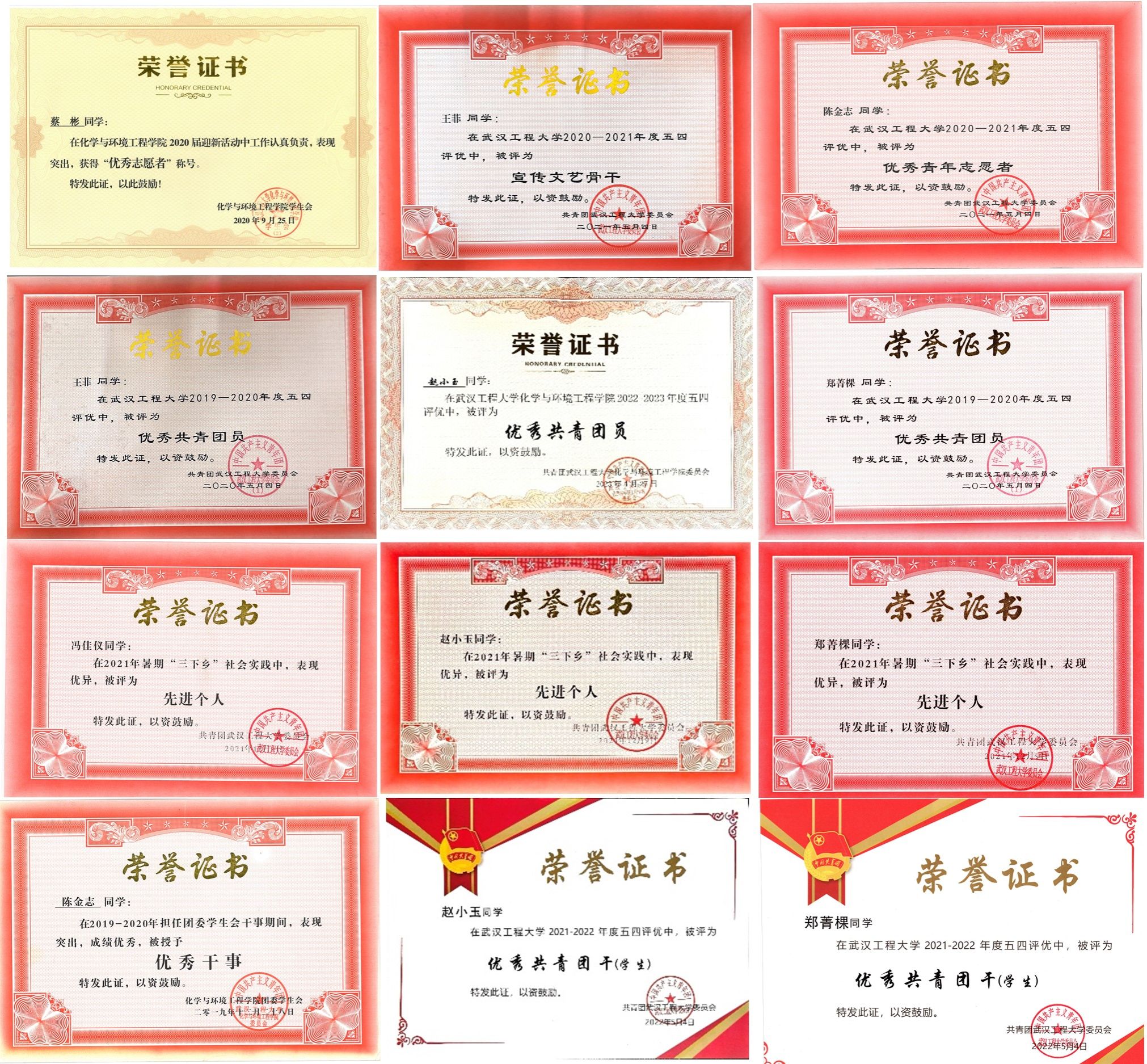 在武汉工程大学9428cn太阳集团古天乐有这样一个团结友爱,德智体美劳全面发展的优秀班集体——2019级环境工程02班。班级同学具有爱学校、爱集体、爱寝室的“三爱”集体意识情怀,荣获运动会及相关集体活动,优秀活力团支部等荣誉奖项5次,院校和校级文明寝室2个。班级总人数26人,17名同学荣获学科竞赛奖项和大创项目(包括国家级4项,省级2项,合计6项),7名同学长期从事学院和学校师生的服务工作并荣获先进个人和优秀工作者称号,在升学和就业过程中,1人入伍,3人考入公务员队伍,2人获得“就业之星”称号,1人获得我院“十大榜样人物”称号,12人升学(46%),成功上岸的高校有厦门大学、中国地质大学(武汉)、华中农业大学、中国海洋大学等重点高校。