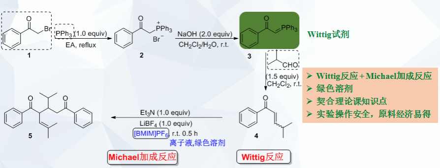 项目简介:有机人名反应是有机化学反应的基石,是应用化学专业本科生必须掌握的有机化学知识点。本项目基于本科生有机化学理论知识基础,设计了一个融合Wittig反应和Michael加成反应两个人名反应的综合有机化学实验,该实验从α-溴代苯乙酮和三苯基膦等廉价易得的原料出发,合成并纯化得到2-异丁烯基-3-异丙基-1,5-二苯基-1,5-戊二酮产物。实验设计内容与本科阶段有机化学理论知识高度契合,涉及多步有机合成,涵盖多种基本实验操作,可锻炼学生的实验设计能力和实验操作能力,并且,实验还引入绿色溶剂离子液体作为反应溶剂来培植学生的绿色化学理念。