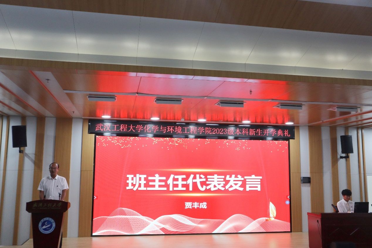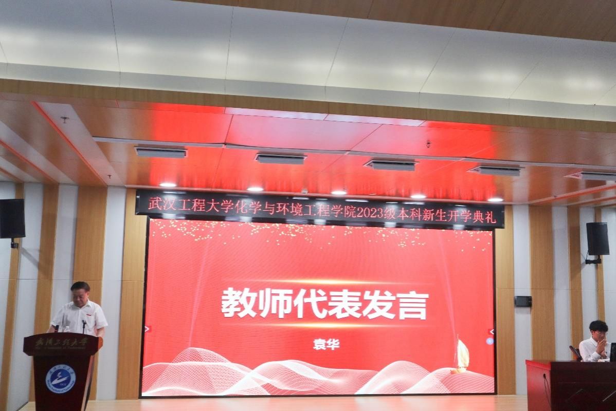 全国优秀教师、武汉工程大学教学名师、学院有机化学教师袁华作为教师代表发言,他引用习近平总书记的话说:教师要做学生为学、为事、为人的大先生,并给全体新同学提出三个努力的方向: