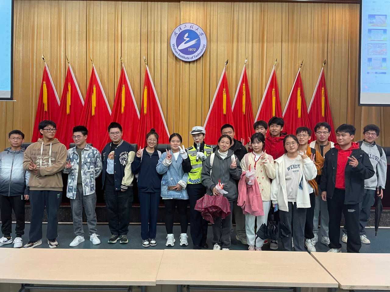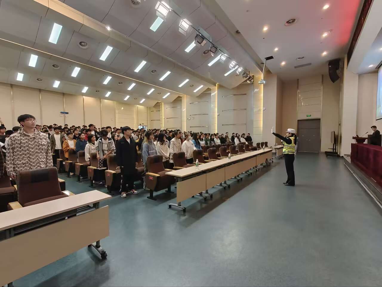 实训实操环节,韩玲警官进行现场教学,将常用交通指挥手势信号进行动作分解和示范,要求全体学生进行模仿学习。同时在讲座结束后,警官随机抽取同学进行交通安全知识问答小测试。