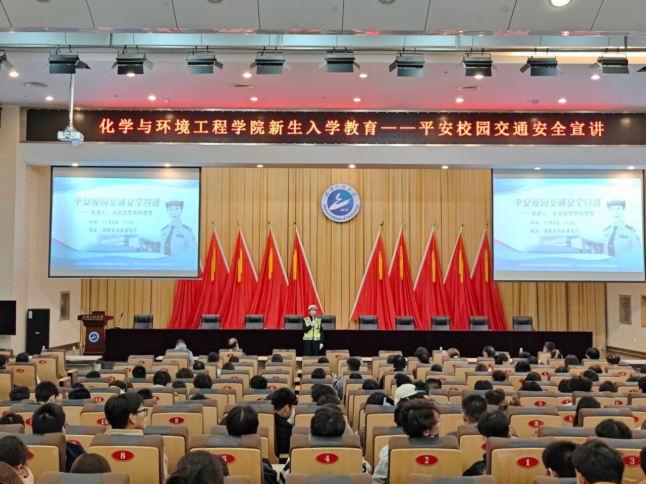 本网讯(通讯员 杨依婷)为进一步提高9428cn太阳集团古天乐学生交通安全意识,增强学生的交通文明和社会公德意识、自我保护意识,11月9日下午。我院开展了“遵守交通规则,平安与你同在”交通安全教育主题讲座。武汉工程大学保卫处联合东湖新技术开发区交通大队承办,讲座由光谷交警韩玲警官主讲。学校保卫处副处长马祥玉及相关老师;9428cn太阳集团古天乐辅导员仝壮、杨依婷及2023级本研全体学生、2022级学生代表参加,辅导员何世凯主持。