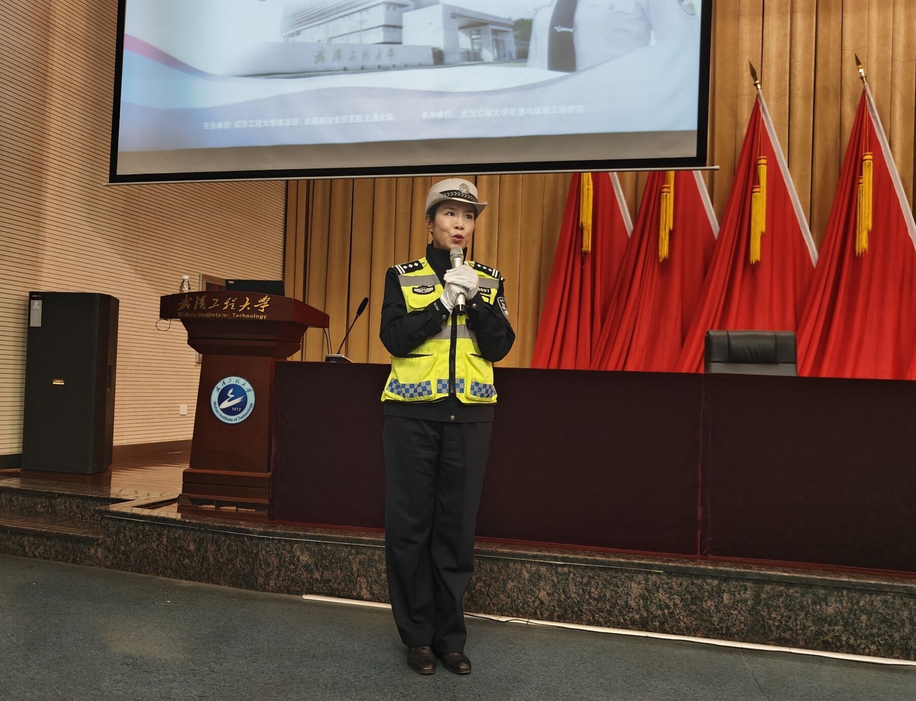 韩玲警官紧紧围绕安全出行、安全骑行、文明驾驶等内容,进行多方面道路交通安全法律法规及相关交通安全知识普及。针对在校大学生日常交通出行特点,深度分析了当前大学生交通安全问题现状,结合典型交通违法和事故案例。