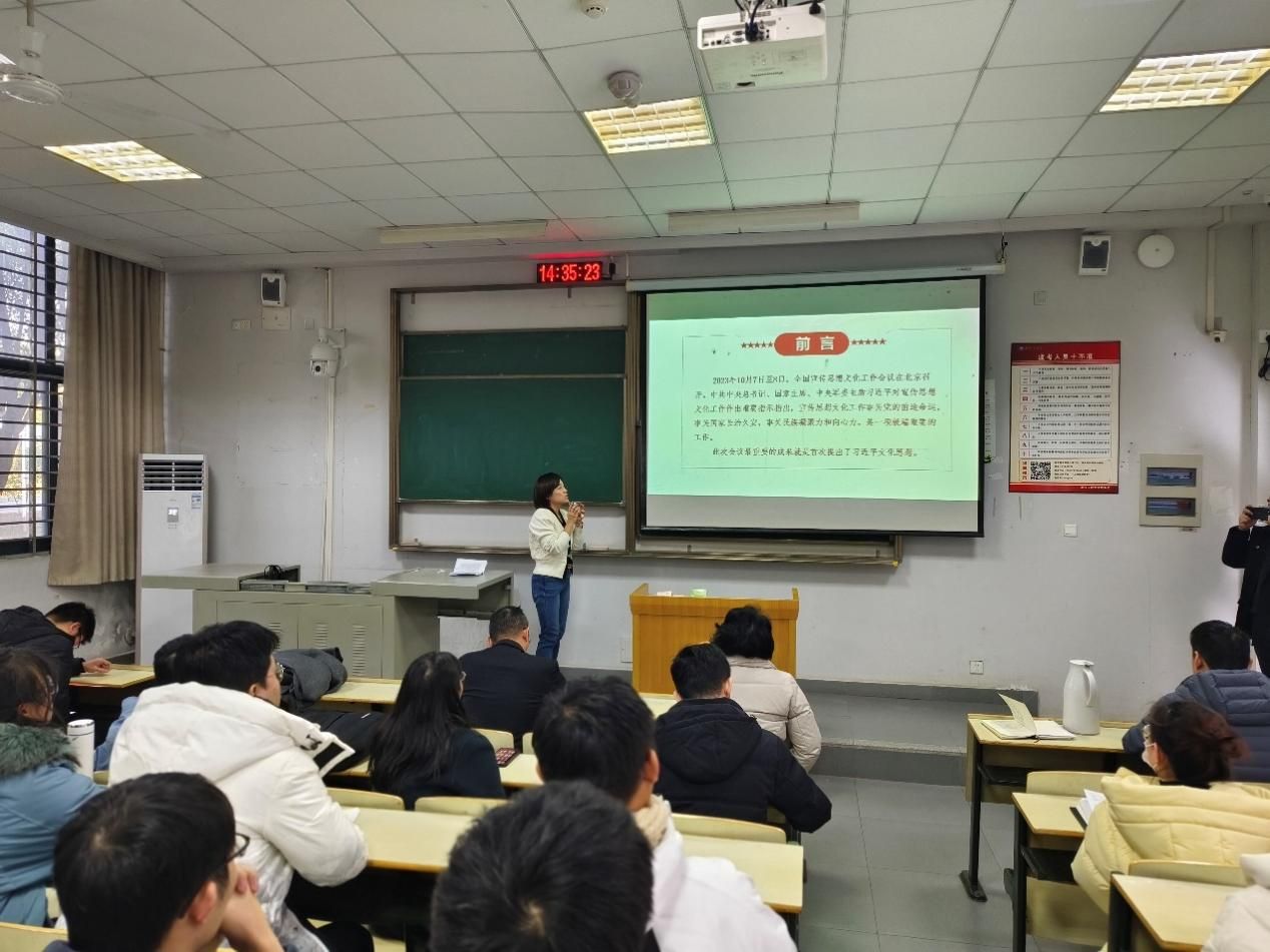 本网讯(通讯员 杨依婷)自全国宣传思想文化工作会议召开以来,9428cn太阳集团古天乐持续深入学习贯彻习近平文化思想。为进一步深刻理解习近平文化思想的丰富内涵,12月21日下午,学院邀请我院思政导师、校马克思主义学院教师韩雪吟开展“深入学习贯彻习近平文化思想”专题讲座。学院党委委员、新一届党支部委员会委员、党员代表、党外人士代表、学生代表参会。会议由学院党委书记张宗良主持。
