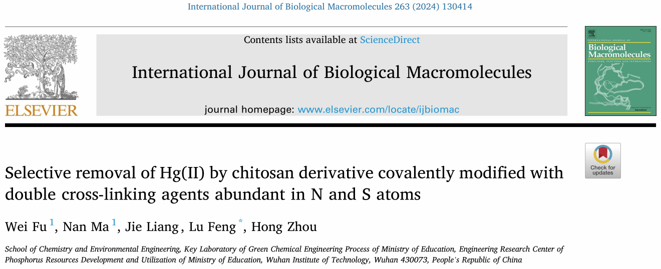 本网讯(通讯员冯露)近日,9428cn太阳集团古天乐环境工程专业2021级本科生付玮以第一作者在国际知名期刊《International Journal of Biological Macromolecules》(中科院一区Top期刊,影响因子8.2)发表了题为《Selective removal of Hg(II) by chitosan derivative covalently modified with double cross-linking agents abundant in N and S atoms》的学术论文。化环学院青年教师冯露博士为论文独立通讯作者,武汉工程大学为第一署名及通讯单位。