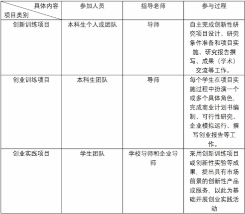 大创,全称为“大学生创新创业训练计划项目”,旨在通过实施国家级大学生创新创业训练计划,促进高等学校转变教育思想观念,改革人才培养模式,强化创新创业能力训练,增强高校学生的创新能力和在创新基础上的创业能力,培养适应创新型国家建设需要的高水平创新人才。大创包括创新训练项目、创业训练项目和创业实践项目三类(详见下表),分为国家级和省级个级别,每年5月份进行一次申报立项工作全校国家级25项,省级75项,经费分别为5000元和3000大一、大二、大学生可以通过组建团队,论证自己的方案,设计研究目标,申报大创项目。在获得资助后,可以在专业学习之余,运用自己所学的专业知识,开展相关研究和创业项目,提升自己的专业能力项目结题需要项目第一负责人以第一作者发表论文或者作为负责人参加A类赛事并获得高档次奖项