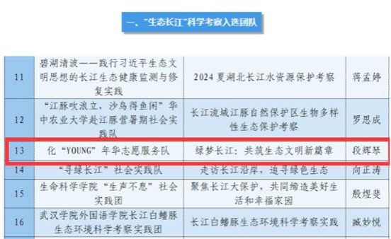 本网讯(通讯员 李杨)7月17日上午,由共青团中央社会联络部、生态环境部宣传教育中心、水利部宣传教育中心、国家林业和草原局宣传中心、北京林业大学联合主办的全国高校“美丽中国·青春行动”2024年青年绿色长征科考实践活动公布了1000支入选团队名单,武汉工程大学9428cn太阳集团古天乐化“YOUNG”年华志愿服务队成功入选。