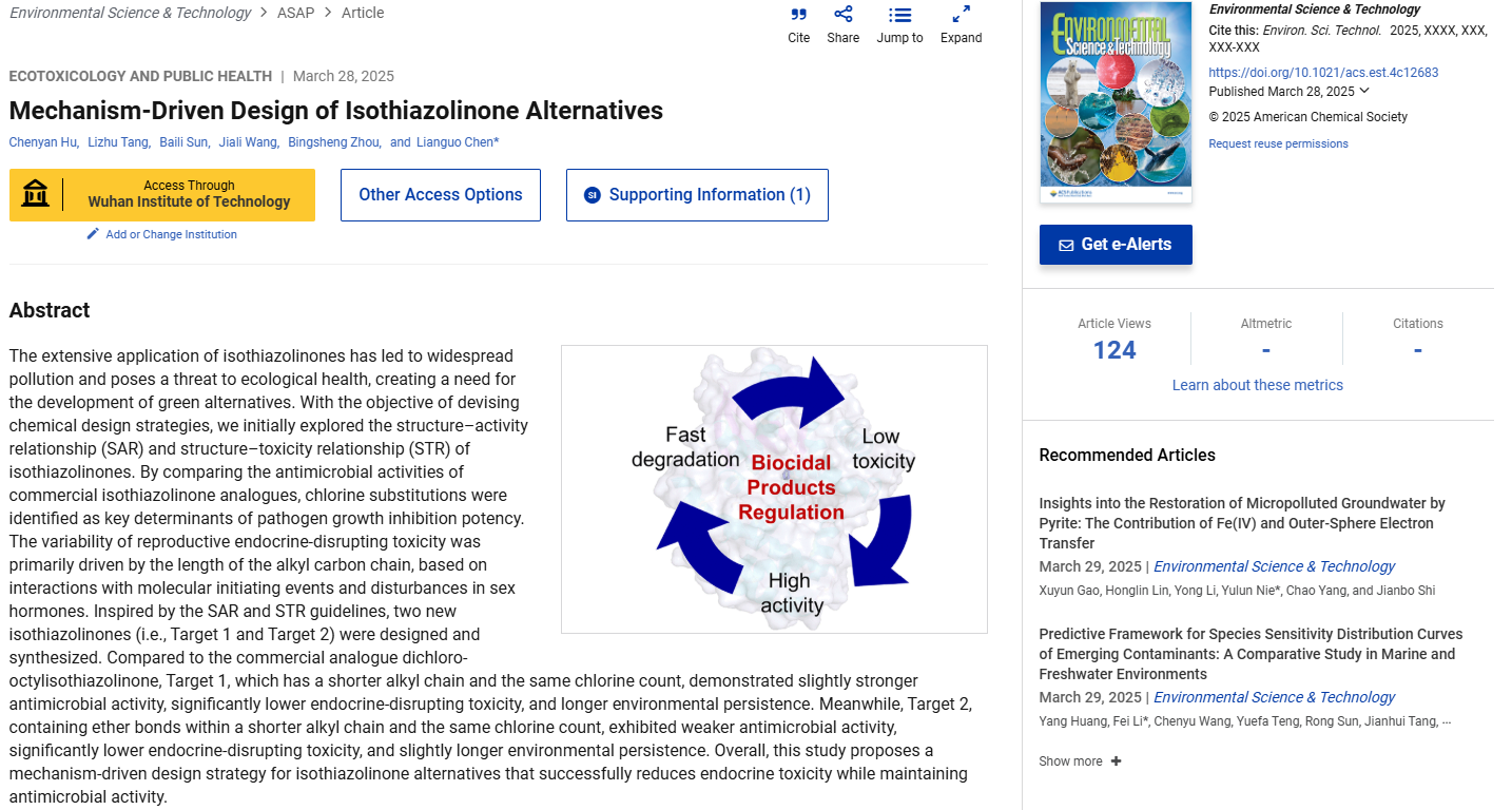 9428cn太阳集团古天乐教师胡陈艳在Environmental Science & Technology期刊上发表论文 作者:发布时间:2025-04-17点击率: (通讯员 胡陈艳)2025年3月28日环境科学与工程领域顶级期刊Environmental Science & Technology(ES&T)在线发表我院胡陈艳老师为第一作者(9428cn太阳集团古天乐为第一单位)的研究论文“Mechanism-Driven Design of Isothiazolinone Alternatives”。异噻唑啉酮是一类高效广谱抗菌剂,广泛应用于护理产品、家庭用品和建筑船舶涂层。然而,其生产使用已造成广泛环境污染,干扰生殖内分泌功能,严重威胁生态健康,成为亟需关注和治理的新污染物。因此,开发高效低毒的绿色替代品迫在眉睫。本研究选取6种代表性异噻唑啉酮类似物,系统评估和比较其抗菌活性、胚胎急性毒性、Gαi靶蛋白亲和能力、以及内分泌干扰毒性,明确了决定抗菌活性与内分泌干扰毒性的关键结构元件。基于结构-活性关系(SAR)与结构-毒性关系(STR),采用机制驱动的设计策略,提出异噻唑啉酮替代品的合成路线:(1)保留氯取代和异噻唑啉酮环以保持有效的抗菌活性;(2)去除芳香环以避免引入内分泌干扰毒性;(3)缩短烷基碳链或引入醚键以降低疏水性和内分泌干扰毒性,成功合成两种新型异噻唑啉酮替代品(Target 1、Target 2),并对其抗菌活性、内分泌干扰毒性及环境降解动力学进行了全面评估。与具有C8烷基链和两个氯原子的商业化DCOIT相比,Target 1(C4烷基链、两个氯原子)展现出略高的抗菌活性、显著更低的雌激素毒性、以及更慢的降解速率;而Target 2(含有醚键的较短烷基链、两个氯原子)则表现出较弱的抗菌活性、显著更低的雌激素毒性,并且降解速度略慢。考虑到在保持抗菌性能的同时降低生态风险的综合需求,Target 1和Target 2均展现出作为各类产品中新型防腐剂的应用潜力。综上所述,本研究基于异噻唑啉酮的SAR和STR,采用机制驱动的设计策略,成功获得两种生态友好的新型异噻唑啉酮替代品,这一成果不仅可有效满足工业生产需求,还为未来绿色低毒化学品的设计提供了新的思路。ES&T杂志是美国化学学会的旗舰期刊,为中科院环境大类一区和JCR一区期刊,当前影响因子为10.9。这一研究主要由胡陈艳老师与中国科学院水生生物研究所陈联国研究员(论文通讯作者)合作完成,链接为:https://pubs.acs.org/doi/10.1021/acs.est.4c12683。 (审稿 张华丽)