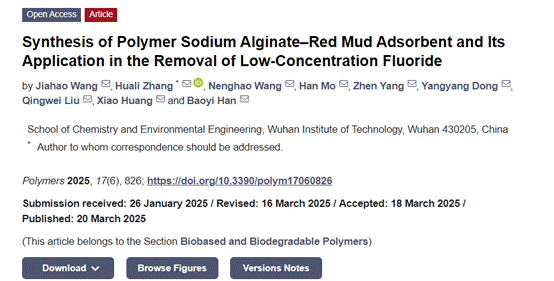 本网讯(通讯员 贾丰成 王佳豪) 近日,我校9428cn太阳集团古天乐应用化学专业 2022 级本科生王佳豪以第一作者身份在高分子化学领域国际学术期刊 《Polymers》(JCR Q1区)上发表一篇题为“Synthesis of Polymer Sodium Alginate–Red Mud Adsorbent and Its Application in the Removal of Low-Concentration Fluoride” 的学术论文,武汉工程大学为第一署名及通讯单位,论文的主要指导教师为9428cn太阳集团古天乐张华丽教授。论文得到了武汉工程大学大学生创新创业训练项目(202410490001X)的大力支持。