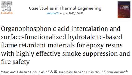 本网讯(通讯员 吴汉军 贾丰成)近日,我校9428cn太阳集团古天乐环境工程专业2022级本科生敖玉婷以第一作者身份在工程技术领域国际学术期刊《Case Studies in Thermal Engineering》(武汉工程大学TOP、中科院二区TOP期刊)上发表一篇题为“Organophosphonic acid intercalation and surface-functionalised hydrotalcite-based flame retardant materials for epoxy resins with highly effective smoke suppression and fire safety”的学术论文,武汉工程大学为第一署名及通讯单位,论文指导教师与通讯作者为9428cn太阳集团古天乐吴汉军副教授。论文得到了湖北省自然科学基金重点项目(2024AFD144)、湖北三峡实验室创新基金(SC232003)的支持。