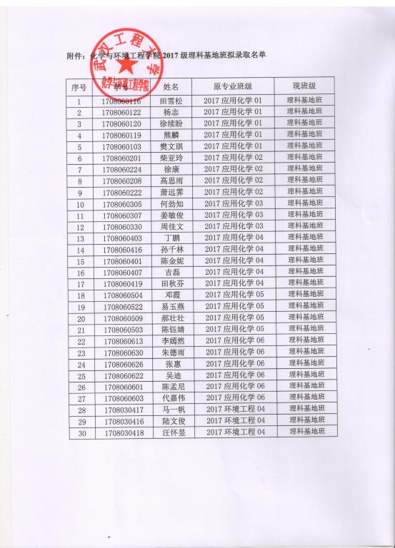 9428cn太阳集团古天乐关于2017级应用化学专业理科基地班入选名单的公示