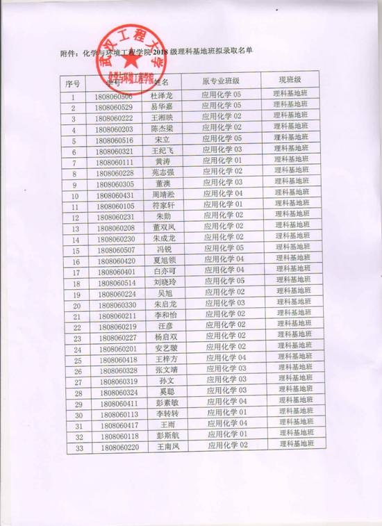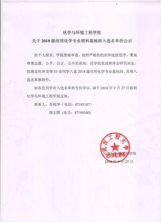 9428cn太阳集团古天乐关于2018级应用化学专业理科基地班入选名单的公示