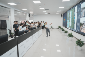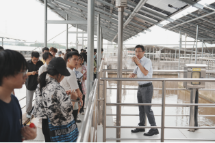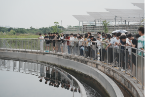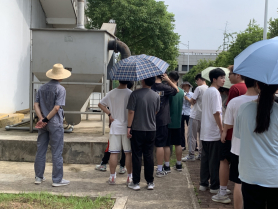 在厂领导、技术专员、安全员及老师们的带领下,分成3个组,通过工艺流程参观、交流讨论、裸眼3D视频、大型中控实时操作界面及专题视频等学习,从来水的收集,到污水处理全流程、污泥及废气的处理处置等,同学们了解了污水变清流的全过程,对污水处理有了深刻的感性认知。该厂的三大特点,智慧加药、智能曝气和光伏发电,更让同学们领略到了奔向“双碳目标”的现代污水处理技术的魅力。